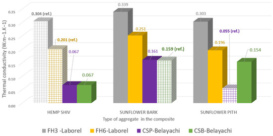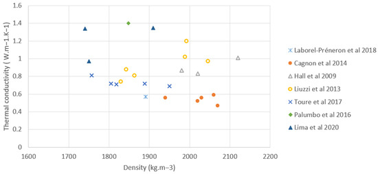 | Laborel-Préneron et al., 2018 [10] | Hemp shiv | From measurement on bulk particles | 0.044 | 0.066 |