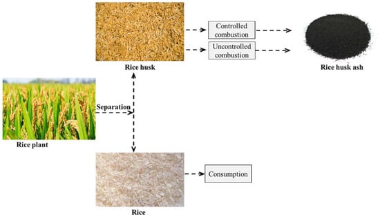 Rice is an important essential food for nearly half of the world’s population [10]. More than seventy countries produce rice, including China, India, and Indonesia. In many rice-producing countries, the most common agricultural waste is the rice husk. As part of the milling process (Figure 1), rice husks (rice hulls) are strong protective coatings for rice grains, and they are removed from the rice seeds as a by-product [11]. Around one hundred million tonnes of this by-product are sourced from rice field processing worldwide. They have a very low bulk density ranging from 90 to 150 kg/m3. This results in a larger value of dry volume. The rice husk itself has a very rough surface and is abrasive in nature. Therefore, it is resistant to natural degradation. This would lead to environmental challenges with improper disposal. The three polymers cellulose, hemicellulose, and lignin make up the rice husk biomass [11].