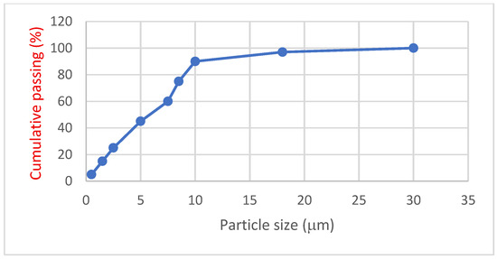 Rice husk from Punjab province, Pakistan (Khan and Company Ltd., Cardiff, UK), was chosen to test its suitability as an ash substitute for PC in concrete. In the laboratory, rice husk was burned at 800 °C in a stable environment. After reaching the necessary temperature of 800 °C, the ash was cooled by spreading it in trays at laboratory ambient temperatures of 20 ± 1 °C. After burning the rice husk, only 22% of the ash was collected. It was sieved into 200 or 325 μm mesh after being ground in a milling machine (CF420 electric rice husk milling machine, by Laizhou Chengda Co., Ltd., Yantai, China). The particle size distribution is shown in Figure 2. The size ranges from 3 to 18 μm and average of 7 μm. The specific gravity of the substance was 2.1. The chemical analysis of the RHA is presented in Table 2.