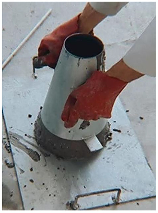 Slump testing is a laboratory or on-site method of determining concrete consistency/workability and the water/cement ratio indirectly for approval purposes or to record mixture characteristics. The slump test indicates the uniformity of concrete in various batches. The shape of the concrete slumps reveals details about the concrete’s workability and quality. The workability of a fresh concrete mix is measured using Gilson slump cones (Gilsonco, Lewis Center, OH, USA), which are shown in Figure 4, and follows the relevant BS EN 12350-2:2000 [29] requirements.