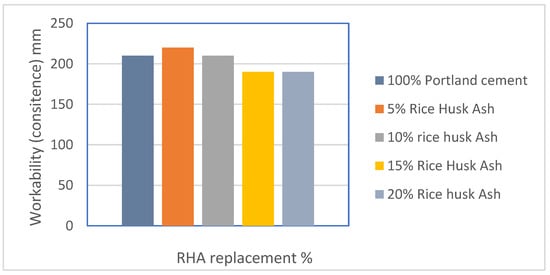 Table 4 and Figure 5 show a slight increase in the workability of concrete with a 5% replacement level of RHA, where the mix was cohesive in contrast to the control sample. This agrees with the literature, which shows that a low level of replacement for RHA (at 5%) increases concrete workability [34,35]. However, increasing the percentage of RHA to 10% and beyond to 15% and 20% maintains a similar level of workability of the RHA concrete. This also complies with some of the published work that shows the workability of concrete and mortar decreasing as cement is replaced with RHA [36,37].