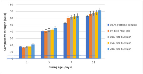 The compressive strength test results are shown in Figure 6, which shows that the control (100% PC) mix had a lower compressive strength than the other mixes at all curing ages (1, 3, 7, and 28 days). Only the 5% RHA mix had a lower compressive strength than the control sample on day 1. Initially, RHA samples of 5% and 10% replacement levels at the early curing age (day 3) have weaker compressive strength than the control mix [37]. The 5% and 10% RHA mixes, on the other hand, demonstrated improved compressive strength after 3 days of curing. For all curing ages, the mixes of 15% and 20% RHA replacement achieved even higher compressive strength compared to control. The RHA appears to improve the packing quality of the cement paste in the concrete mix, which might relate to its particle size (average of 7 μm, and Figure 2) and properties that when RHA replaces Portland cement, it provides improved void filling of the cement paste. Also, a contributor to this would be the pozzolanic reaction between RHA and the calcium hydroxide Ca(OH)2 (portlandite) [38]. These findings are similar to those achieved using 10% microsilica with RHA by Zareei et al. [39] to enhance the concrete mix on days 7 and 28. However, they are contrary to those by Kamau et al. [40] and Rasoul et al. [41], who demonstrated a reduction in strength for RHA concrete from that of control (PC concrete) on days 7 and 28, which can be due to variations in the RHA properties as well as the mixing and testing conditions [42].