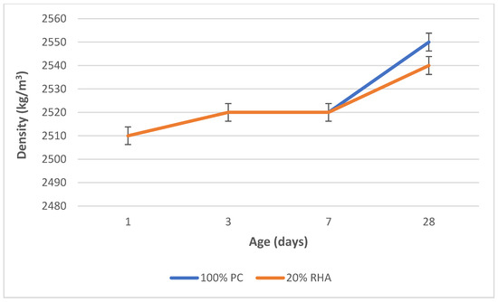 The effects of replacing cement with RHA at 20% on the concrete density as it matures are demonstrated in Figure 7, which also includes the standard deviation of the density measurements. Up to 7 days of curing, the density of RHA concrete is the same as that for control (100% PC). However, beyond that, the concrete tends to have a slightly lower density for RHA replacement. This would be due to the lower density of rice husk ash (specific gravity of around 2.1) compared to Portland cement (specific gravity of 3.1). This indicates that while the RHA can produce lighter concrete, it also increases the strength of the concrete, as shown in Figure 6.