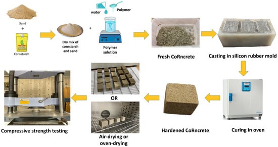 The combination of starch, sand, and polymer solution was appropriately mixed following the mixing methods described above and poured into a silicone rubber mold. The mold allowed the formation of three cubic samples with the dimensions of 2 × 2 × 2 inch (5.08 × 5.08 × 5.08 cm), which were then cured in an oven at 110 °C. Each silicone rubber mold contained a total of around 750 g of fresh CoRncrete to accommodate three cubic samples. Following the ASTM C109 testing procedure, a tampering rod was used to tamp each cubic sample approximately 32 times [46]. Any excess mixture on top of the mold was leveled off using a screed. The rubber mold was secured between two plates and tightened with screws to minimize moisture loss during the curing process. Subsequently, the mold was placed in a convection oven (Precision Scientific, Inc.; Winchester, IL, USA) and cured at a temperature of 110 °C for 24 h. After curing, the samples were oven-dried or air-dried. Oven-drying was performed by putting the samples in the same convection oven at 100 °C for 24 h. Meanwhile, air-drying was performed by putting the samples in the lab environment for 7, 14, 21, and 28 days. The temperature and relative humidity of the lab were 23 °C and 30%, respectively. After the drying process, the weight of each sample was measured using a laboratory weight scale and the volume of each sample was found to be constant (2 × 2 × 2 inch). The density of the CoRncrete cubes was calculated from the weight and volume values. The samples were then stored in a sealed Ziplock bag to prevent further interaction with the environment until testing. The entire manufacturing process of CoRncrete is depicted in Figure 1.