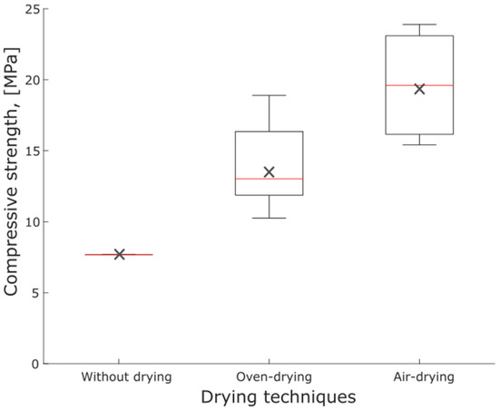 Effects of varying drying techniques on the compressive strength of CoRncrete (without polymers) (red line indicates median and black cross indicates mean values).