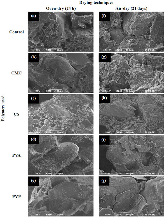Scanning Electron Microscopy (SEM) images of hardened CoRncrete using different drying techniques and polymers as admixture. (a–e) display the SEM images of samples oven-dried for 24 h, (f–j) show samples air-dried for 21 days, (a,f) represent control samples, (b,g) contain CMC, (c,h) include CS, (d,i) incorporate PVA, (e,j) feature PVP as admixtures.