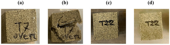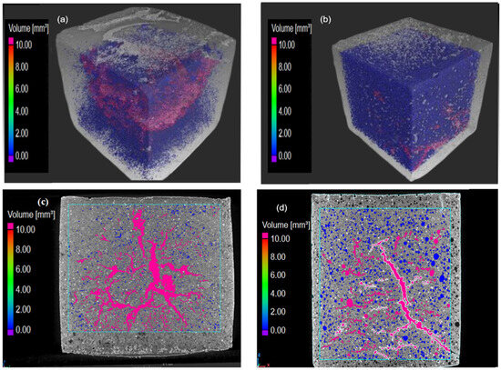 A comparison between the oven-dried and air-dried samples revealed significant differences in the volume and distribution of porous spaces. The oven-dried samples exhibited a considerably higher volume of porous space compared to the air-dried samples, which is shown in Figure 4a,b. In particular, the porous spaces in the oven-dried samples were predominantly concentrated in the center of the cube, whereas in the air-dried samples, these pore spaces were distributed throughout the entire cube. Additionally, the oven-dried samples exhibited larger cracks, accounting for approximately 70% of the total porous spaces. Contrariwise, the air-dried samples revealed fewer cracks, with the largest cracks making up around 34% of the overall porous spaces, which is half the proportion observed in the oven-dried samples. The higher incidence of larger cracks in the oven-dried samples can be attributed to the rapid drying process. This rapid drying causes the outer surface to dry much faster than the inner core, leading to significant moisture gradients. These gradients result in tensile stresses within the material, promoting the formation of larger cracks as the inner core continues to lose moisture more slowly. Figure 4c,d illustrate the crack patterns of the samples. The same patterns of void space distribution and cracks were also found for the samples subjected to 7, 21, and 28 days of air-drying.