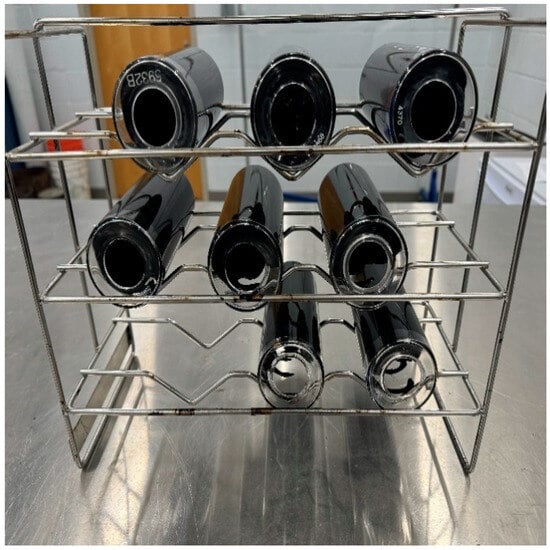 The RTFO aging process simulates the short-term aging of asphalt binders that occur during production and placement. Following AASHTO T240-22 [], binder samples (35 ± 0.5 g) were poured into glass containers and conditioned for 60 min before being aged in the RTFO chamber as shown in Figure 1. The aging process was conducted at 163 °C for 85 min under an air-pressure environment, ensuring uniform oxidation and volatilization effects. The RTFO apparatus accommodates up to eight bottles simultaneously during the aging process.