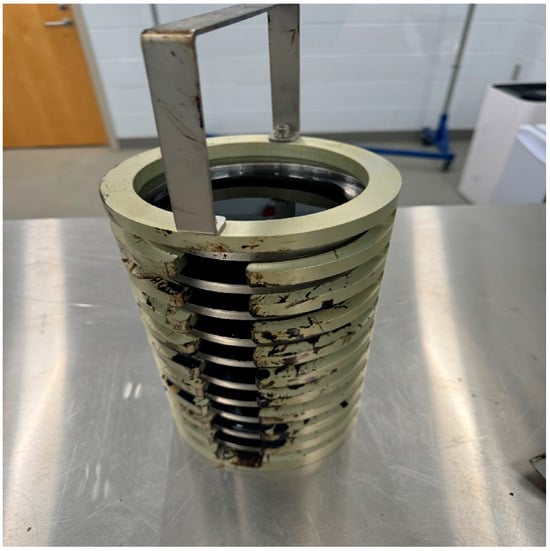 The PAV aging procedure replicates long-term oxidative aging, simulating in-service binder aging over pavement life, as per AASHTO R28-22 []. RTFO-aged virgin binders and RAP binders (without RTFO aging) were heated and poured into stainless steel PAV pans (50 ± 0.5 g each) before being subjected to 2.1 ± 0.1 MPa of air pressure for 20 h. The PAV system allows for simultaneous processing of up to ten pans, ensuring controlled long-term aging conditions as shown in Figure 2.
