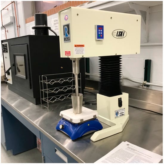 A Ross 100 L high-shear laboratory mixer, depicted in Figure 3, was utilized to achieve homogeneous blending of virgin and RAP binders at 15%, 25%, and 40% replacement levels. Virgin and RAP binders were measured, heated to the designated temperature, and blended at 5000 rpm for 2 min to ensure consistency without spillage. Vacuum Degassing Oven (VDO) treatment was applied only to pure PAV-aged RAP samples to remove entrapped air.