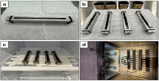 Preparation and testing of asphalt binder beams for the BBR test: (a) assembly of the BBR beam molds; (b) casting of asphalt binders into the molds; (c) freezing the molds to facilitate demolding and ensure shape retention; (d) conditioning of asphalt binder beams for 60 min in the BBR chamber prior to testing.