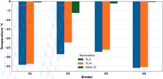 In contrast, V1 (PG 64-34) and V4 (PG 58-34) demonstrate values within the safe range at −0.54 °C and −0.42 °C, respectively, indicating better relaxation properties and lower susceptibility to low-temperature cracking. This is supported by their more negative values, which suggest stronger stress relaxation capabilities at low temperatures. Additionally, their stiffness-related values are more negative, indicating a lower risk of embrittlement.