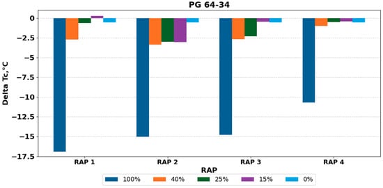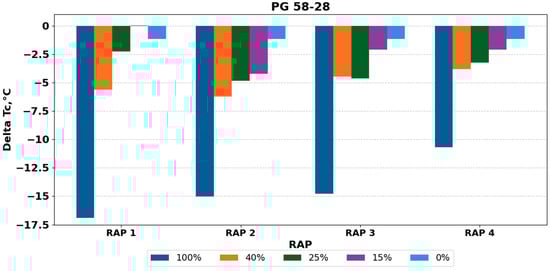 This parameter provides insights into a binder’s ability to relax stress and resist non-load-related cracking, such as thermal cracking. More negative values indicate reduced relaxation properties and higher susceptibility to cracking, making it a useful tool for assessing long-term binder performance [,,]. Researchers have recommended thresholds of −2.5 °C as a warning level and −5.0 °C as a critical failure limit to ensure binders maintain adequate stress relaxation and resistance to premature cracking [].