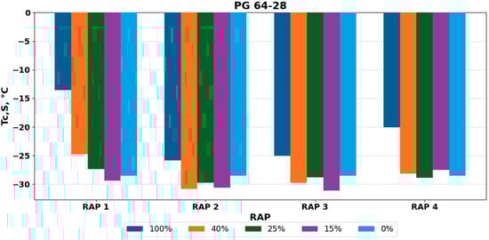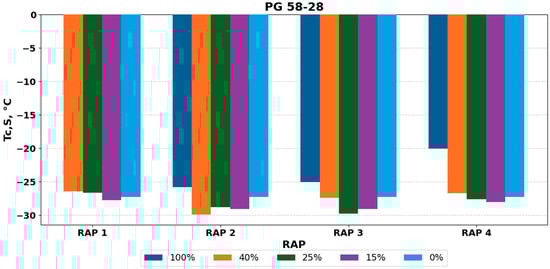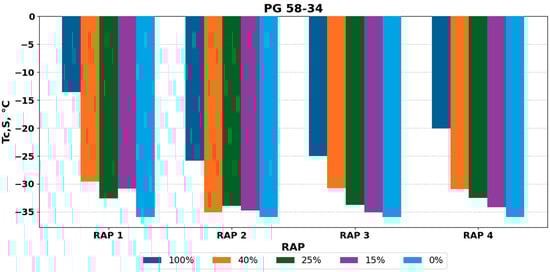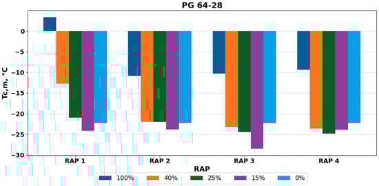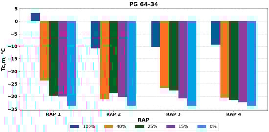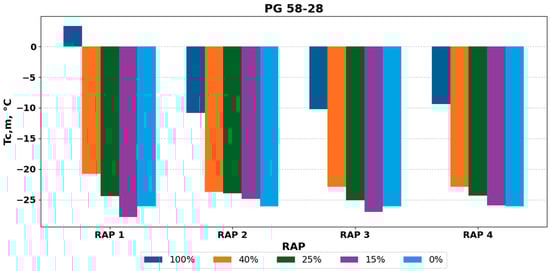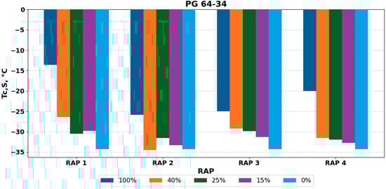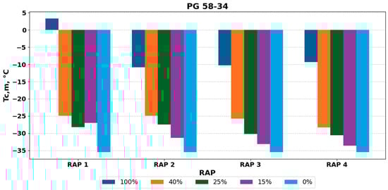 Figure 8 and Figure 9 show that increasing RAP content also led to higher critical temperatures and for most samples, reflecting increased stiffness and reduced relaxation properties. However, one RAP2 sample (40%) deviated from this trend, showing a decrease in value. Overall, RAP2 blends exhibited the most significant risk, while RAP4 blends had the least impact on low-temperature performance.