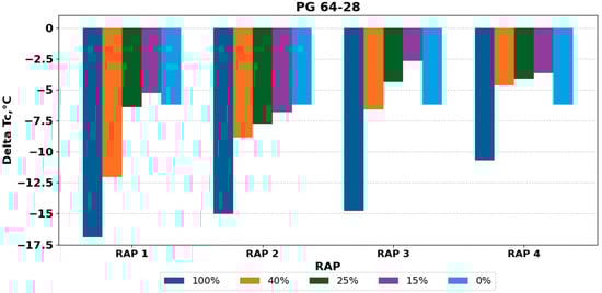 Figure 14 and Figure 15 illustrate changes in critical temperatures and with increasing RAP content. A general warming trend was observed for , with increased RAP content, except for blends with 15% RAP1 and 15% RAP3, where values remained relatively unchanged. For , a cooling trend was observed for most samples, but this had no significant effect on the overall cooling trend of .