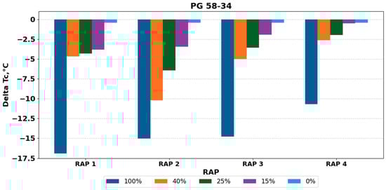Figure 17 and Figure 18 illustrate the corresponding changes in critical temperatures and with increasing RAP content. A consistent warming trend was observed across all 12 samples, with increases in both stiffness and slope critical temperatures compared to the pure virgin binder. This trend indicates that higher RAP content significantly increases binder stiffness and reduces its ability to relieve thermal stresses. These findings align with the overall reduction in values, emphasizing that RAP incorporation has a pronounced effect on both critical temperatures and binder performance.