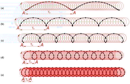 In the second case, the rotation rate of the deforming element around the center of a circle with radius Rg and the speed of its translational motion along the axis (feed) are independent values. Their combination makes it possible to obtain curves that are different in shape (Figure 1a,c–e).