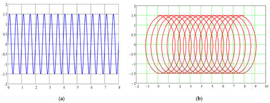 In the first case, the deforming element’s movement describes a cycloid—the dynamic trajectory of any point that belongs to a circle with radius Rg, which rolls without slipping along a straight line (Figure 1b). When a circle with radius Rg rolls along a straight line, its instantaneous center of rotation, that is, the point of the lower quadrant, will constantly change. In other words, per one complete revolution of the circle, it will move along the axis by a value equal to its length 2·π·Rg.