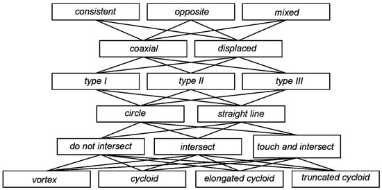 Classification makes it possible to create a set of 432 possible variants of partially regular microrelief grooves formed by rotation. Schematically, a set of variants of microrelief grooves is presented in Figure 6.