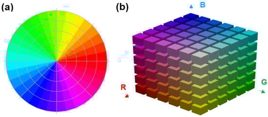 The color wheel (see Figure 2a) is a graphical representation of colors, arranged in a circular spectrum and organized according to their relationships in terms of hue, saturation, and brightness [,]. In its most common form, the wheel includes primary colors (red, blue, and yellow), secondary colors (obtained by mixing two primary colors), and tertiary colors (created by mixing a primary color with a secondary color) (see Figure 2a). The color formats used in images are based on specific color models related to the color wheel. Understanding the relationship between the color wheel and color formats is essential for achieving effective and consistent visual results [].
