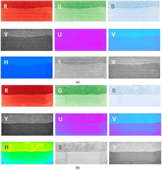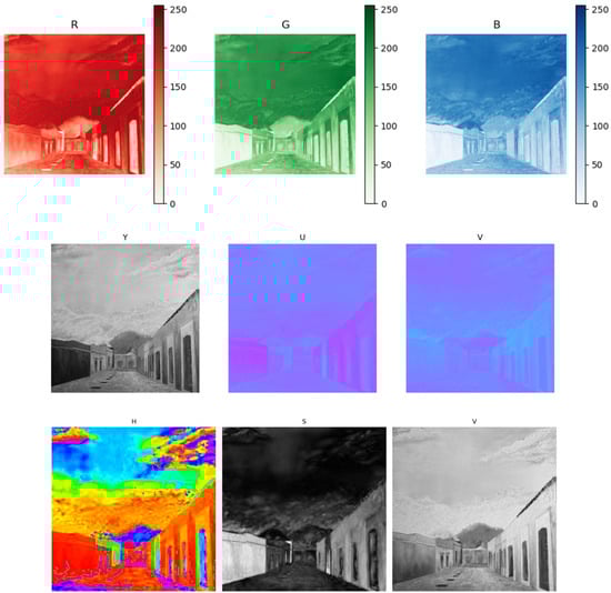 Color systems corresponding to the image illustrated in Figure 3. Systems: RGB (red, green, and blue), YUV (luminance, chrominance U, and chrominance V), and HSV (hue, saturation, and value).