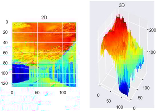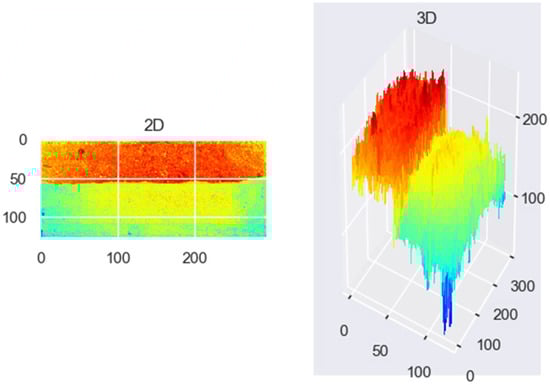 (b) Dimensionality reduction (PCA): dimensionality reduction is an essential mathematical technique that simplifies multidimensional data, enabling more effective management of design projects. Figure 7 illustrates information related to three attributes derived from the painting presented in Figure 3. With these three attributes, the data can be visualized in three dimensions. Data can be projected onto a plane to facilitate simpler visualization. One of the most fundamental and powerful methods in this context is principal component analysis (PCA) [,]. PCA aims to transform a high-dimensional dataset into a reduced set of variables, known as principal components. Figure 8 displays the results obtained after applying principal component analysis (PCA) to reduce the dimensionality of a problem associated with the study of attributes derived from the image of the painting shown in Figure 3. The objective is to automatically identify and isolate the most illuminated region of the painting. As mentioned before, in Figure 8, the dataset has been projected into a two-dimensional space, allowing for a clearer visualization of the different clusters associated with the various characteristics of the painting.