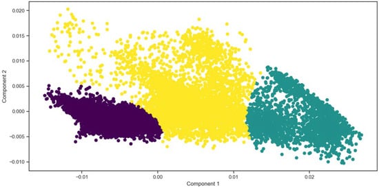 (c) Clustering: in the expansive realm of machine learning, clustering emerges as a powerful and versatile technique within the realm of unsupervised learning. Unsupervised learning is distinguished by its ability to extract knowledge from data without the use of prior labels, with clustering serving as a fundamental pillar in this domain [,]. Clustering, or group segmentation, is a process that involves dividing a dataset into groups or clusters, where the elements within each group are more similar to each other than to those elements outside the group. Figure 9 shows the result obtained after applying the K-means technique to detect three clusters of points.