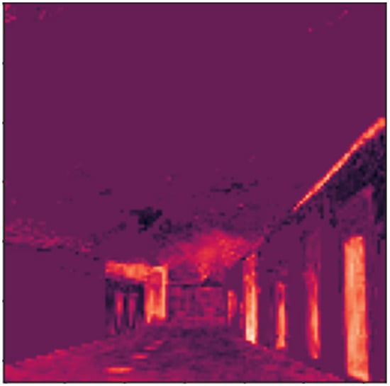 (a) Attribute selection: attribute selection in unsupervised learning involves choosing which features of the data are most important for the computer to correctly process the information. For example, if the goal is to identify the most illuminated regions of a painting, such as the one illustrated in Figure 3 [], which depicts a perspective view of a tourist walkway in Oaxaca, attributes must first be extracted from a digital photograph of the painting. The computer must process the input information corresponding to these attributes to distinguish the regions of interest. Attributes can correspond to the various combinations of RGB or YUV values (see Figure 4, Figure 5 and Figure 6) present in each pixel. In Figure 5, the attribute representing the contours of the buildings is visible. This attribute was obtained through a genuine combination of RGB values, wherein the edges were emphasized []. Identifying the most relevant attributes in an image may require several iterations to clearly determine which features are most significant [,]. Artistic paintings can display a diverse spectrum of tones, ranging from dark areas to bright and luminous regions. Similarly, images of construction materials, such as bricks, also reveal a distinct array of visual characteristics. In the RGB (red, green, and blue) color model, darker (“wet”) areas of a brick might be represented by lower values across each color channel, whereas brighter (“dry”) regions would be indicated by higher values. In contrast, when analyzing the same brick image within the YUV color space, the differentiation between dry and wet areas may be attributed to the luminance (Y) and chrominance (U and V) components. Here, luminance reflects the intensity of brightness, while chrominance captures subtle variations in moisture and texture. This comparison highlights how the choice of color representation can significantly influence the perception of visual characteristics, whether in artistic paintings or in construction materials. Once the key attributes are identified, the next step is to simplify data complexity through dimensionality reduction, ensuring that the essential visual characteristics are preserved for effective analysis.