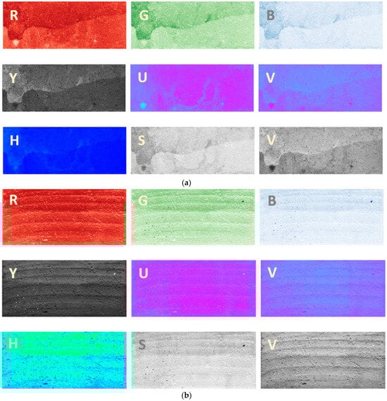 - The RGB, YUV, HSV, and HSI formats provide detailed information about luminance, hue, saturation, and value, playing an important role in the reduction of uncertainties in the detection of areas with moisture and permeability issues. RGB and HSI formats are particularly useful in the mitigation of uncertainties during the detection of chlorides, which tend to darken the brick over time more markedly than water after their introduction into the sample. At later stages, efflorescence begins to develop.
