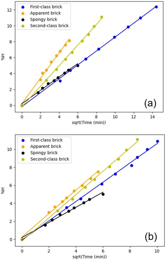 - In some instances, the rate of change in moisture content relative to the square root of time for the spongy brick was similar to that of first-grade brick. Given that the rate of change in moisture content relative to the square root of time followed a linear trend across all four brick types, it can be concluded that the brick fabrication process is consistent and effective.