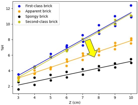 The diffusion equation describes how energy (in the form of heat) or mass (in the form of moisture) is transferred from regions of high concentration to regions of low concentration []. The direction of transfer is driven by the temperature gradient (for heat) or the moisture concentration gradient. The diffusion coefficients ( for moisture and  for heat) are critical parameters. These determine the rate at which the studied quantity (heat or moisture) diffuses through the medium. High values of these coefficients indicate a greater rate of diffusion []. For an estimation of the hydraulic diffusivities of bricks, the sharp front model concept was utilized []. The capillary diffusivity of most porous materials exhibits substantial variation with liquid content, leading to very steep capillary absorption profiles. Consequently, it is often practical and beneficial to depict the wetted region as a rectangular or sharp-fronted profile, which is referred to as the sharp front approximation []. Utilizing this model allows for relatively simple mathematical descriptions of the numerous wetting processes []. We also assume that the water content in the bricks is proportional to the products of porosity and water saturation []. The estimated effective hydraulic diffusivity values, calculated with an invasion front height of 6 cm, align with those documented in the specialized literature. The observed variability in hydraulic diffusivity can be attributed to several factors, including porosity, the presence of microfractures, material imperfections, and contaminants. These elements influence the movement and distribution of fluids within the material, thereby affecting its hydraulic properties.