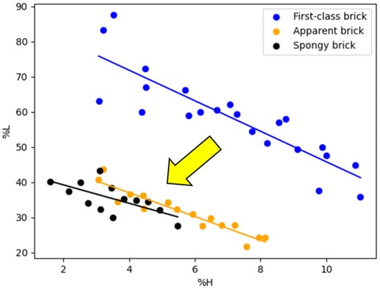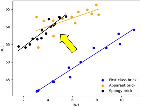 - The percentage of luminosity was found to be sensitive to slight inclinations of the first-grade brick, while the hue values fitted a single regression line better, being less sensitive to various environmental variations. This was except for certain outliers that could be associated with drastic light absorptions and fluorescence, likely due to the combined influence of various factors, such as: (a) the presence of rock fragments that could contain grains of quartz; and (b) the presence of genuine clays that can absorb various components generated in chemical reactions (which may occur during the capillary rise of water in the brick); these clays could exhibit honeycomb-like molecular structures.