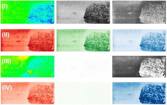 Figure 16 and Figure 17 present the images associated with those regions that correspond to the sky and buildings of the painting shown in Figure 3. Similar to its application in painting restoration, PCA could be employed to highlight the most relevant features that influence the estimation of moisture levels in bricks.