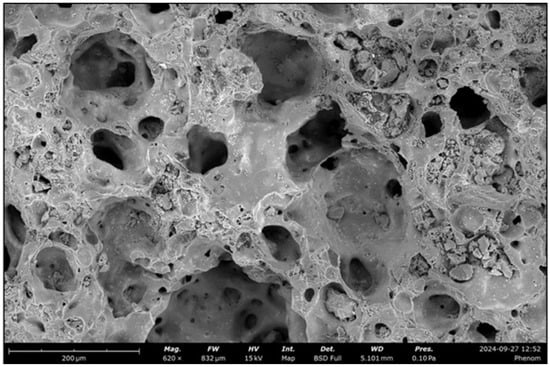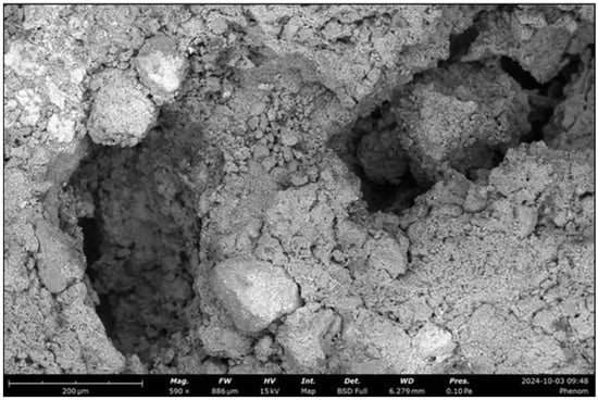 - The scanning electron microscope (SEM) images presented in Figure 33, Figure 34 and Figure 35 provide key insights into the pore structures of different brick types. Specifically: (a) the spongy brick exhibits a highly interconnected pore network, which significantly enhances its permeability. This interconnected structure facilitates the movement of fluids through the brick, making it highly permeable. (b) The apparent brick exhibits a partially interconnected pore system. Manufactured at a lower temperature than the spongy brick, it retains a substantial amount of “intact” clay. The presence of this clay enhances water absorption in the apparent brick relative to the spongy brick. (c) The first-class brick was produced at a lower temperature than the apparent brick, resulting in an even higher proportion of “intact” clay. This clay content significantly contributes to the brick’s water absorption capacity. Furthermore, the clay content influences the brick’s structural integrity, reducing its permeability while increasing its water retention performance. These characteristics may impact the brick’s long-term durability and resistance to environmental conditions. (d) The spongy brick, with its porous and interconnected structure, can be likened to a 3D gyroid-like assembly, similar to recent advancements in three-dimensional (3D) graphene composites []. In much the same way that 3D graphene materials exhibit a unique balance between strength and lightness, due to their intricate geometric arrangements, the spongy brick achieves significant mechanical resilience under both static and dynamic loads through its own complex pore structure. Much like 3D graphene, the spongy brick’s pores are not just random voids but, rather, form a highly organized network that resembles the gyroid patterns observed in advanced materials. This geometric arrangement allows for an efficient distribution of forces across the brick, enhancing its ability to bear heavy loads without structural failure. The solid material surrounding the pores in the spongy brick functions similarly to the robust carbon framework in porous graphene composites, reinforcing the brick’s ability to maintain its shape and integrity under high pressure.