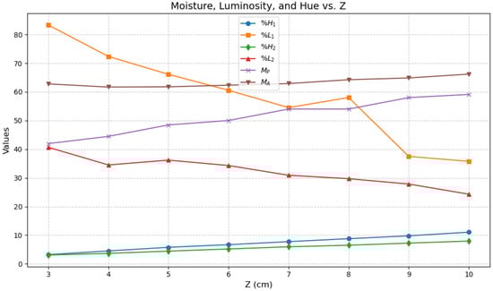 - The percentage of luminosity and hue were inversely and directly correlated, respectively, with the percentage of moisture.