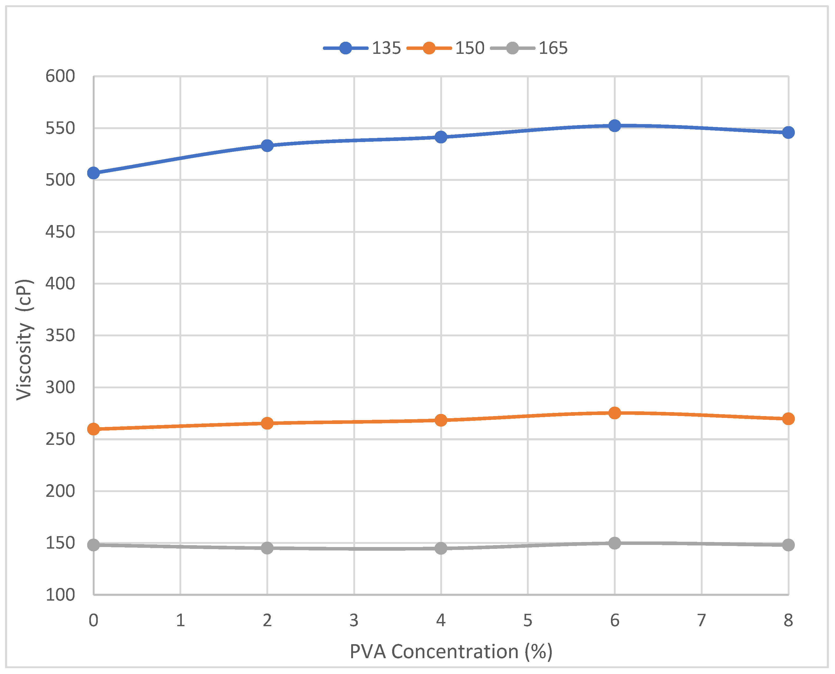 In the viscosity tests performed on bitumen modified with a polyvinyl acetate additive at temperatures of 135 °C and 150 °C, an increase in the viscosity values was observed. In bitumen with a 6% PVA additive, an increase of 8.4% was observed at 135 °C and a viscosity increase of 5.8% at 150 °C. At 165 °C, a slight increase was observed only in bitumen with a 6% additive ratio. The addition of 6% PVA has resulted in an increase in the viscosity of the original bitumen at all test temperatures, which indicates higher rutting performance of the modified bitumens based on the findings of previous research. Styrene–butadiene–styrene (SBS) and rubber additives enhance the viscosity of bitumen, resulting in improved resistance to rutting [