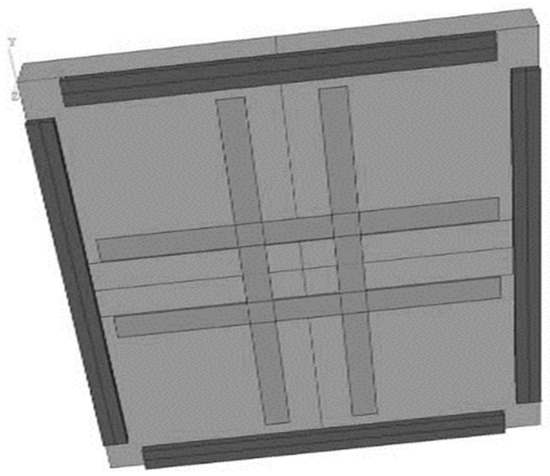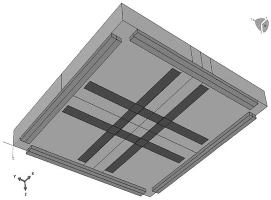 The finite element method was used to model the performance of RC slabs strengthened with carbon fiber-reinforced polymer (CFRP) plates. The ABAQUS software, FEA model suited for finite element analysis developed by SIMULIA, was applied to model the samples. A general comparison was made between the experimental results of two specimens from a dissertation conducted by Abdullah [9] and the numerical model to evaluate the accuracy of the model. The same model and software were used and validated in several publications [19,38,39]. The size of the specimen was selected to depict the area of negative bending surrounding a medium-sized flat plate floor slab’s inner supporting column. The first specimen performed by Abdullah [9] was without strengthening, and the second was strengthened with four CFRP plates, as shown in Figure 1. The concrete characteristic compressive strength was 35 MPa, with a slump of 50 mm. Eight no. 12 mm diameter bars were used to reinforce each flat slab in both directions, producing a 0.33% reinforcement ratio. The tensile yield and the ultimate strengths were 580 MPa and 650 MPa, respectively. The ultimate tensile strength and the modulus of elasticity of the CFRP plates (laminates) with a cross-sectional area of 100 × 1.2 mm were 2970 MPa and 172,000 MPa, respectively, which were tested in accordance with ASTM D3039/D3039M [40]. The concrete sample were cast and tested at The University of Manchester: Manchester, UK. S&P, Switzerland, was the manufacturer of this product. Up to 70% of the volumetric fiber content of these laminates was contained within an epoxy resin matrix. Typically, they are utilized paired with a Weber.tec EP structural adhesive.