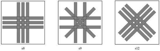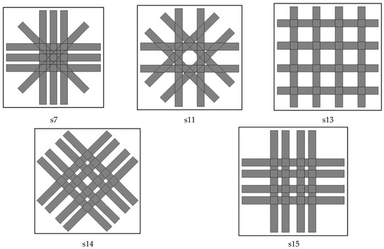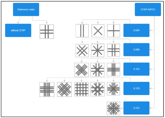 Apart from the two specimens used by Abdullah [9] (i.e., S1 and S2), fifteen RC slabs of 1800 × 1800 mm and 150 mm thickness were analyzed numerically in this study utilizing the ABAQUS software. These specimens were divided into five groups based on the ratio of CFRP plates used in the strengthening of the specimens. The arrangement and details of all groups are shown in Table 1 and the flowchart in Figure 2. The CFRP arrangements of the fifteen slabs are shown in Figure 3, Figure 4, Figure 5, Figure 6 and Figure 7.