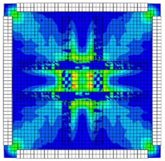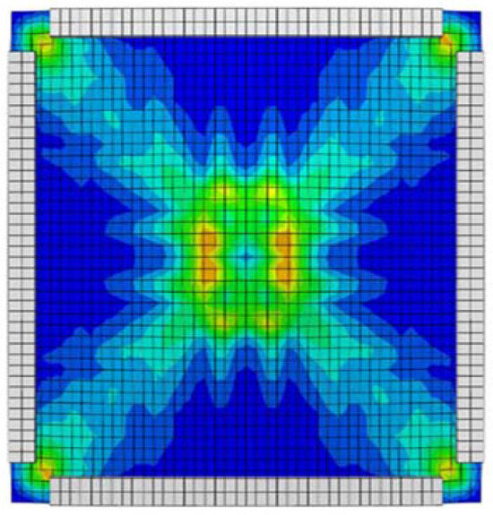 • As shown in Figure 1, the corners of the slab were free to raise, and the slab’s perimeter was only held horizontally. The slab perimeter was supported by a solid surface that extended 1600 mm into the slab. The stress state surrounding the column region could be effectively captured, thanks to this boundary condition representation.