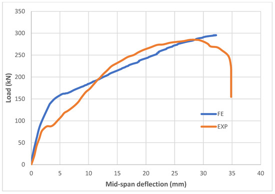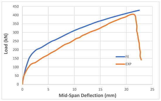 Moreover, the comparison between the numerical and experimental load–deflection relationships of specimens without CFRP is shown in Figure 11. The load–deflection relationships show a good agreement between the numerical and experimental results. However, the experimental load–deflection relationship was stiffer than that produced numerically. The maximum numerical deflection and experimental deflection were 32 mm and 35 mm, respectively. For the failure load, the maximum numerical load and experimental load were 295 kN and 282 kN, respectively. It was observed that the nonlinear behavior of the experimental specimen began at approximately 80 kN, while that of the numerical specimen started after 135 kN.