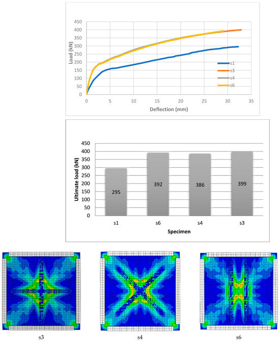 The numerical results of the proposed model indicate a good agreement with the experimental results. Therefore, the proposed model was adopted to study the projected groups of specimens. Figure 14 shows the numerical load–deflection relationship for the first group of specimens in comparison with the specimen without CFRP. The use of CFRP improved the behavior of the load–deflection relationship. In comparison with the specimen without CFRP (s1), the ultimate loads of the specimens (s3, s4, and s6) were increased up to 399 kN, 386 kN, and 392 kN, respectively. In addition to having the greatest ultimate load, the ultimate deflection of specimen s2 was greater than the others. It was also shown that the nonlinear behavior of the specimens without CFRP started after about 100 kN, while that of the specimens with CFRP started after 150 kN.