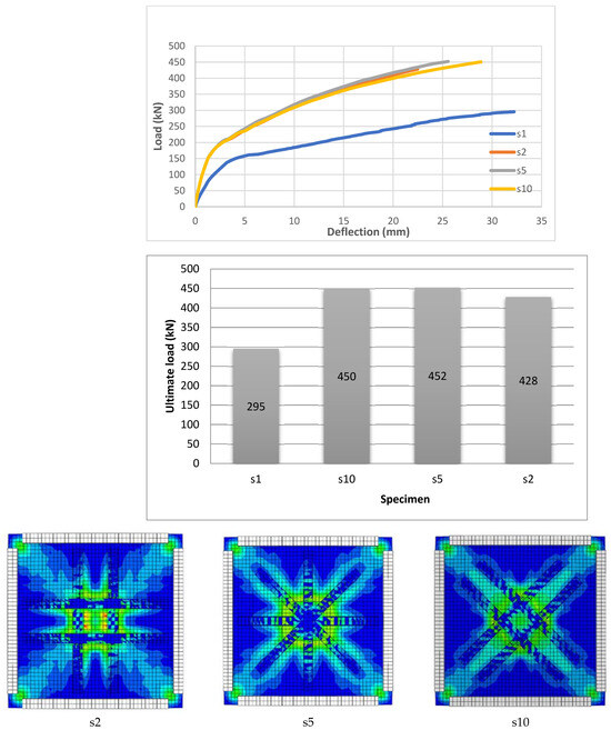 Figure 15 shows the numerical load–deflection relationship for the second group of specimens in comparison with the specimen without CFRP. The use of CFRP improved the behavior of the load–deflection relationship. In comparison with the specimen without CFRP (s1), the ultimate loads of the specimens (s2, s5, and s10) were increased up to 428 kN, 452 kN, and 450 kN, respectively. In comparison with the specimen without CFRP (s1), the ultimate loads were increased by 35% for the specimens with CFRP. The ultimate deflection of specimen S5 was greater than the others with CFRP. The use of CFRP reduced the ultimate deflection of the specimens at failure.