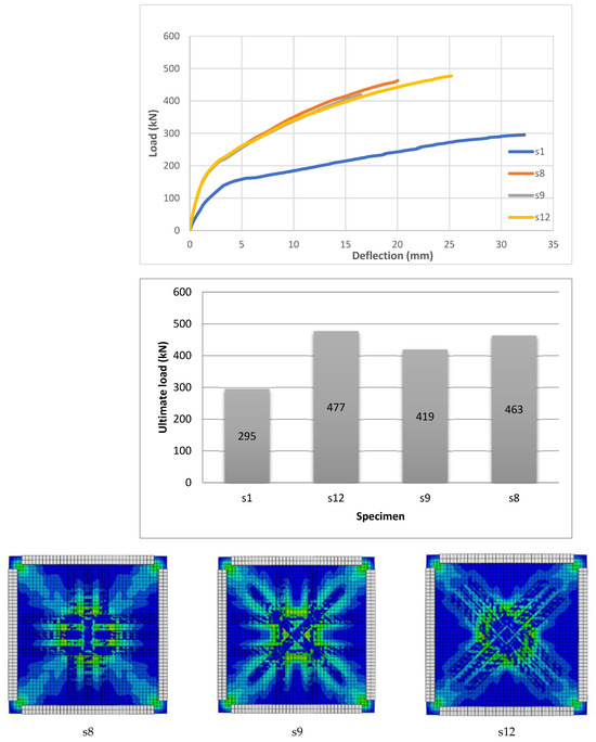 Figure 16 shows the numerical load–deflection relationship for the third group of specimens in comparison with the specimen without CFRP. The behavior of the load–deflection relationship was improved by using CFRP. In comparison with the specimen without CFRP (s1), the ultimate loads of the specimens (s8, s9, and s12) were increased up to 463 kN, 419 kN, and 477 kN, respectively. In addition to having the greatest ultimate load, the ultimate deflection of specimen S12 was greater than the others with CFRP. The deflection at the failure of s12 was more than 5 mm, more than that of the other specimens with CFRP.