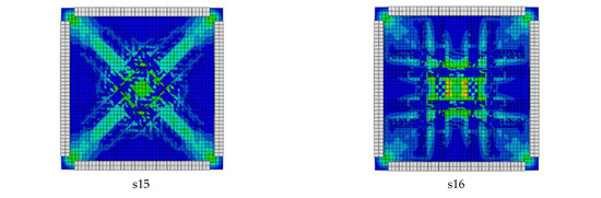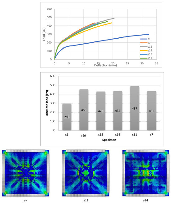 Figure 17 shows the numerical load–deflection relationship for the fourth group of specimens in comparison with the specimen without CFRP. The use of CFRP improved the behavior of the load–deflection relationship. In comparison with the specimen without CFRP (s1), the ultimate loads of the specimens (s7, s11, s14, s15, and s16) were increased up to 432 kN, 487 kN, 434 kN, 429 kN, and 453 kN, respectively. In addition to having the greatest ultimate load, the ultimate deflection of specimen S11 was greater than the others with CFRP. All specimens with CFRP resulted in the same behavior until 200 kN; then, the specimens started having different behaviors with the applied loads.