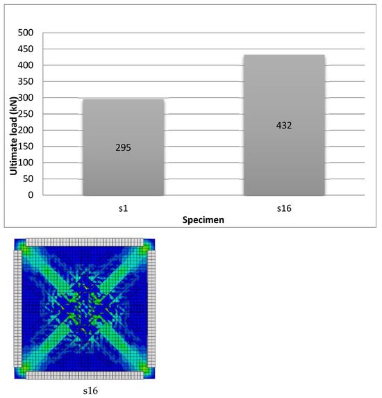 Figure 18 shows the numerical load–deflection relationship for the fifth group of specimens in comparison with the specimen without CFRP. The use of CFRP improved the behavior of the load–deflection relationship. In comparison with the specimen without CFRP (s1), the ultimate load of the specimen (s16) was increased up to 432 kN. The ultimate deflection of specimen S16 was less than that of specimen S1 by 58%. It was also shown that the nonlinear behavior of the specimen with CFRP (s16) started after 160 kN.