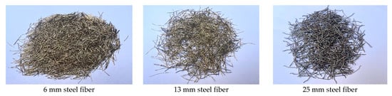 Cement: The cement used is P·O42.5 ordinary Portland cement produced by Chongqing Lafarge Baseway Cement Plant, with a density of 3.1 g/cm3. Fly Ash: low-calcium Class F fly ash provided by Chongqing Hualuo Fly Ash Company was used. Fine aggregate: manufactured limestone sand with a fineness modulus of 3.2, a fine powder content of 3%, an apparent density of 2.7 g/cm3, and a bulk density of 1.5 g/cm3. Coarse aggregate: crushed stone with a size range of 5–10 mm, an apparent density of 2.78 g/cm3, and a bulk density of 1.45 g/cm3. The water-reducing agent is a high-efficiency polycarboxylic acid water-reducing agent master batch with solid content (mass fraction) of 50~60% and is used in 6.5-fold dilution, tap water is used in the laboratory of Chongqing Jiaotong University, the steel fibers are used in the concrete, three kinds of steel fibers with different aspect ratios are added into the concrete for testing, as shown in Figure 1.