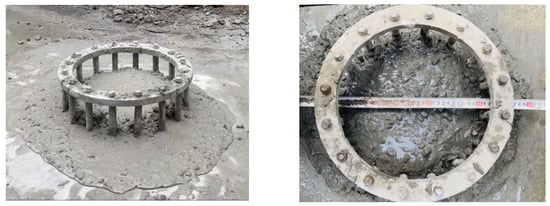 Prior to the commencement of performance research experiments on self-compacting concrete, it is requisite to initially conduct fluidity tests and passing ability tests [] thereon, with the aim of determining the slump flow diameters and J-ring slump flow diameters of self-compacting concrete of different volume contents. The specific testing procedures are as follows: The concrete mixture is loaded into a standard conical slump cone in accordance with the stipulated methodology. Upon completion of filling and leveling, the cone is lifted vertically upwards and then removed to the side. Owing to its self-weight, the concrete mixture undergoes a slumping phenomenon. Subsequently, the dimension of the downward slump is measured, and this measured dimension (expressed in millimeters) represents the slump value. The J-ring slump flow diameter is defined as the average value of the two mutually perpendicular diameters of the expanded surface of the concrete mixture after the termination of its slump flow, as shown in Figure 2.