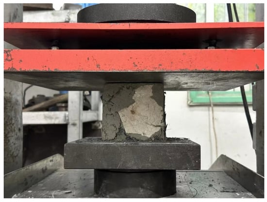 The primary indicators used for assessing the strength of concrete materials are compressive strength and flexural strength []. The 100 mm × 100 mm × 100 mm cubic specimens were used; three identical specimens were prepared for each group, the mold was dismantled after 24 h of molding, and the specimens were taken out after 28 days of curing in a curing box, and the surface of the specimens was cleaned up. The tests were conducted on an MTS universal testing machine, and the specimen axis and the center of the lower pressure plate placed perpendicular to the upper pressure plate were adjusted to the upper surface of the specimen, close but not touching. The test machine was started with pre-pressure, pre-pressure loading speed of 0.5 MPa/s, physical alignment adjustment, and pressure stability adjustment. After the pre-compression was completed, the specimen was loaded at a uniform speed of 2 KN/s until the specimen was damaged, and then it was unloaded slowly, as shown in Figure 3.