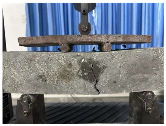 The size of the steel fiber concrete specimen block was 100 mm × 100 mm × 400 mm. The test was carried out on a hydraulic universal testing machine. The long axis of the specimen was perpendicular to the supporting circular axis, the specimen was loaded at a uniform speed of 50 N/s until the specimen was destroyed, and the oil tank of the machine was turned off. After 28 days of maintenance, specimen in the maintenance box was taken out; the surface was cleaned up; the surface of the test piece was checked; the specimen was placed on the test machine; and for the long axis of the test piece and support the vertical column, the distance between the lower two cylindrical supports was 0.3 m, with constraints using a fixed hinge and universal rolling hinge support. The test machine was opened. First of all, the test piece of pre-pressure had a loading force of 1 kN. The test piece was placed in a flat location in order to ensure the specification and safety of the test. The loading was continued, and the specimen did not produce initial damage before a loading rate of 0.06 MPa/s. Once the specimen cracked, it changed the loading method. Displacement control was used, loading until the specimen was destroyed, and then slowly unloading. As shown in Figure 4, the flexural strength of the specimen was expressed in MPa and was calculated according to the following formula: