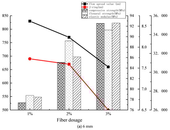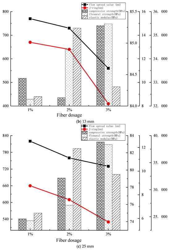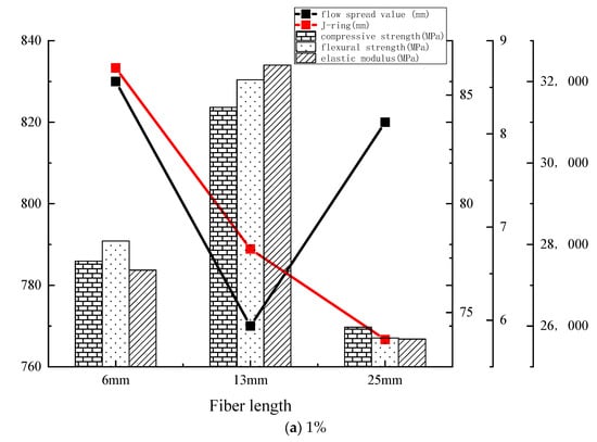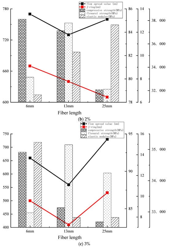 The test results of the mechanical properties of self-compacting concrete under different fiber lengths are shown in Figure 6.